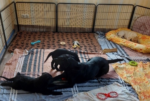 Die Welpen wachsen bei uns im Haus auf und lernen dort alle Alltagsgeräusche kennen. Staubsauger, Geschirrspüler, Telefon, Fernseher/Radio usw. sind ihnen dann schon vertraut.